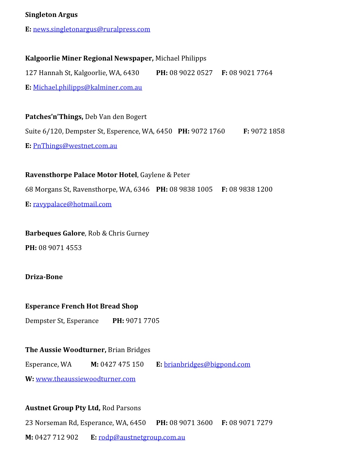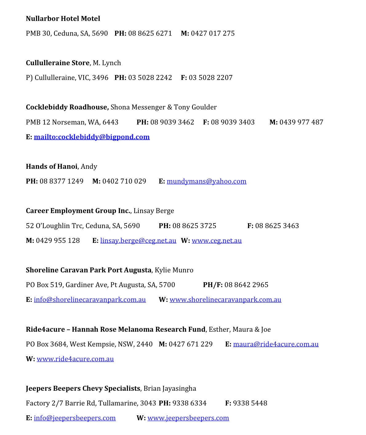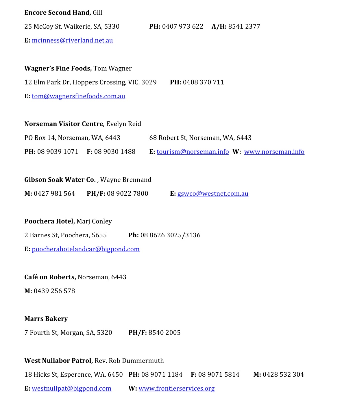 Please note email and website addresses do not link to external sites/mail, sorry for any inconvenience